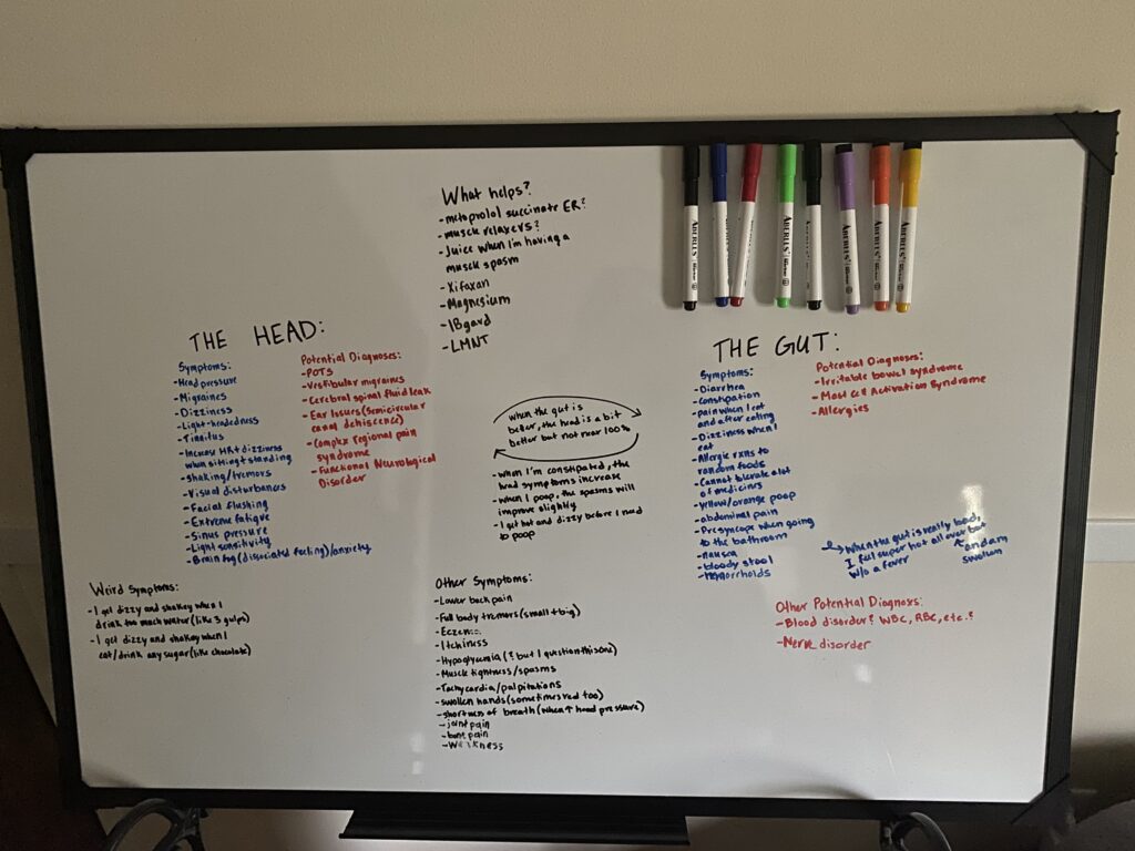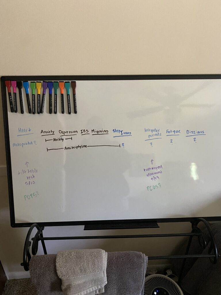 I also sit and write on my whiteboard my symptoms and different diagnoses just so that when I do meet with doctors I am prepared