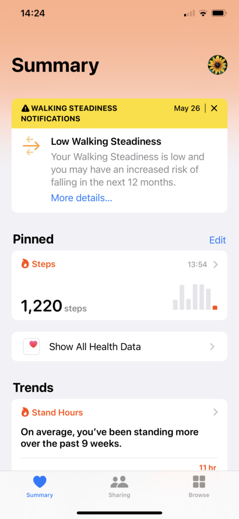 In the left picture my Apple let me know that I have low walking steadiness and a fall could be happening in the next 12 months