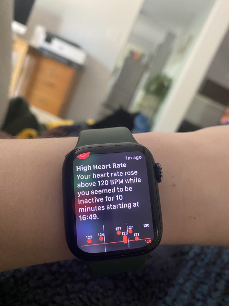 In the picture on the right is my Apple watch again letting me know that my heart rate is high when it looks like I’m not moving